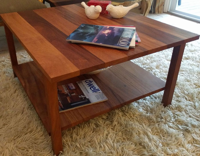This cumaru two-tier coffee table has a top surface and lower shelf that are contructed from 1" thick machined cumaru hardwood that is joined together with waterproof and foodsafe adhesive as well as mechanical fastening through the use of internal sipo mahogany tenon joinery. The legs are crafted from 1-7/8" cumaru hardwood squares.