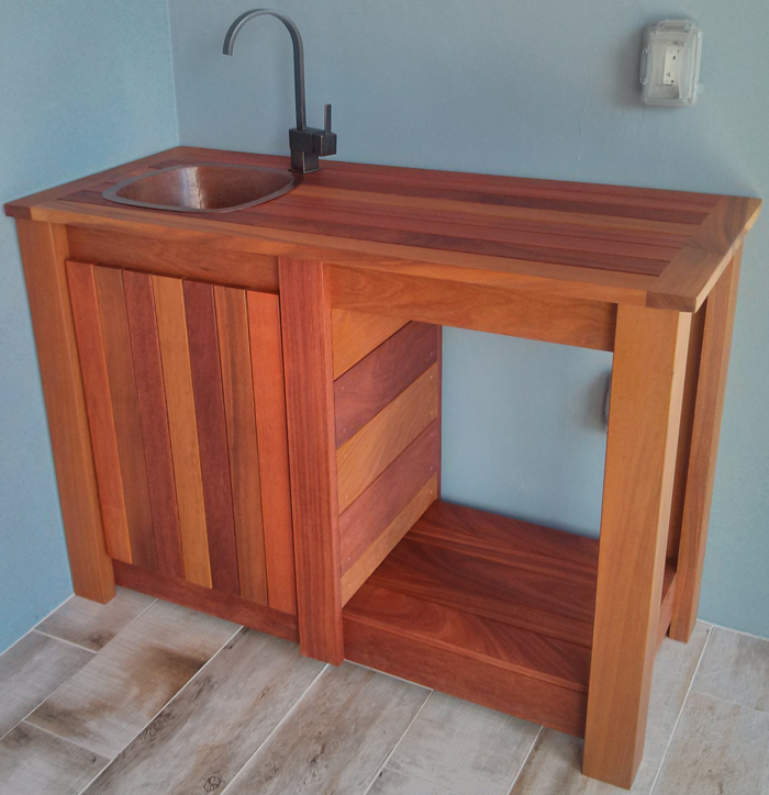 The outside wet bar was created from 4" solid square columns and 2-3/4" slats that are 1" thick for the top. The aprons, door and shelves were fabricated from 4/4 Cumaru. The final wet bar design also included a hand-hammered copper sink and bronze swiveling flat-stream faucet.