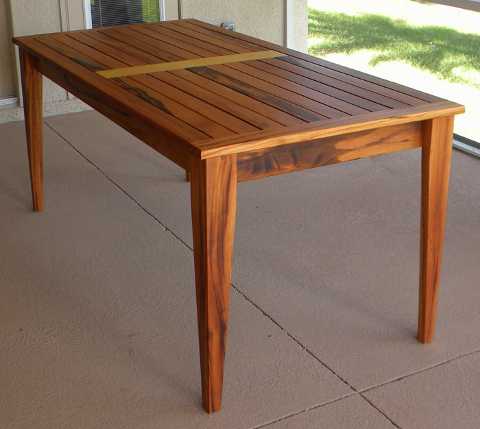 The Tigerwood dining table was created from 4" solid square columns and 2-3/4" slats that are 1" thick for the top. The aprons were also fabricated from 5/4 Tigerwood for strength across the width of the table. The tabletop design also included a 4" wide Garapa sapwood accent bridge that was also 1" thick. The accent bridge transfers any loads from the slat top into the aprons and finally to the legs. All of the tables joints were fashioned from internal Mahogany tenons.