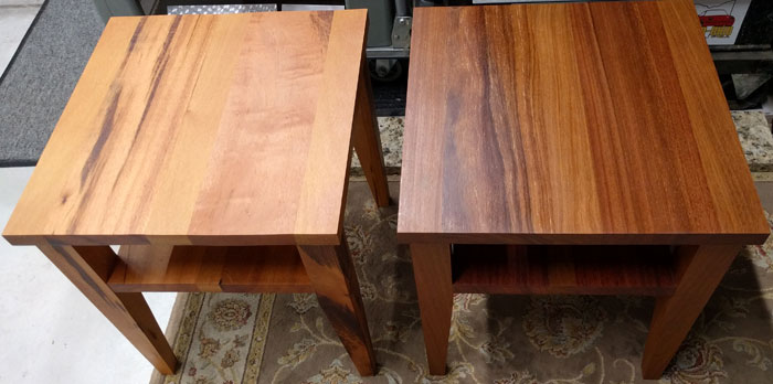Pictured here are a pair of our magazine end tables or magazine side tables. The lighter colored example here is made from Tigerwood and Garapa. The darker more brownish or reddish table is made Cumaru (Brazilian Teak).