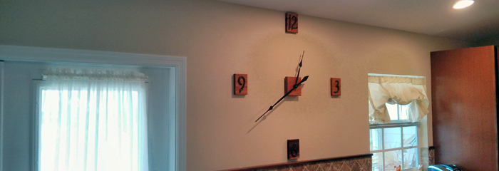 This unique wall clock was created to fit a specific wall in need of a decorative and useful time piece that could be seen throughout the greatroom. Five blocks of the beautiful figured tigerwood were chosen and adorned with black numbers. Very large 18 inch hands and an extremly powerful high-torque clock engine were chosen to drive the elongated pointers. Ths clock was finished with rosewood oil and installed in the customer's kitchen.